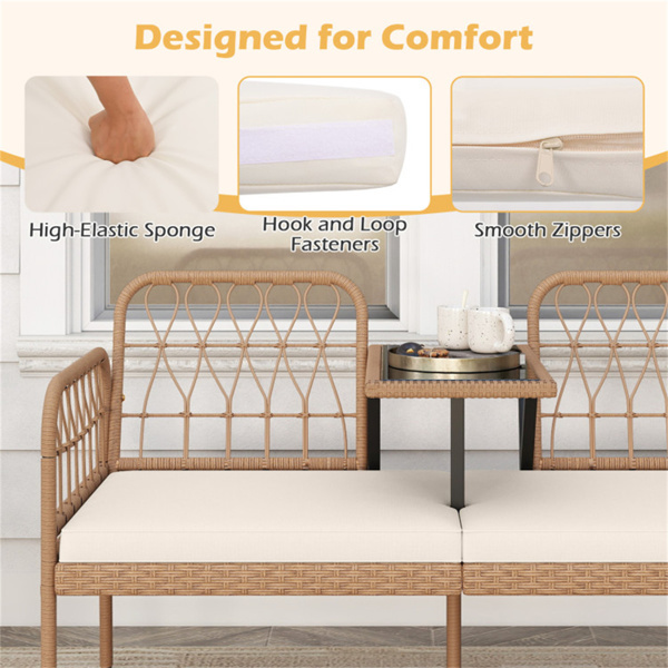 • Built-in Coffee Table: Topped with tempered glass, the built-in coffee table in this patio wicker loveseat provides a 22" × 12" surface for placing beverages, snacks, or other outdoor essentials. Moreover, the suction cups and triangular structures ensure stability and safety during use.