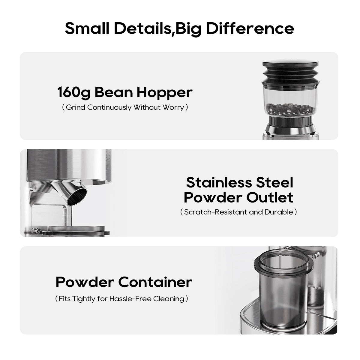 160g beN material hopper with scratch-resistant stainless steel components. Thoughtful design enables continuous grinding and easy cleaning.