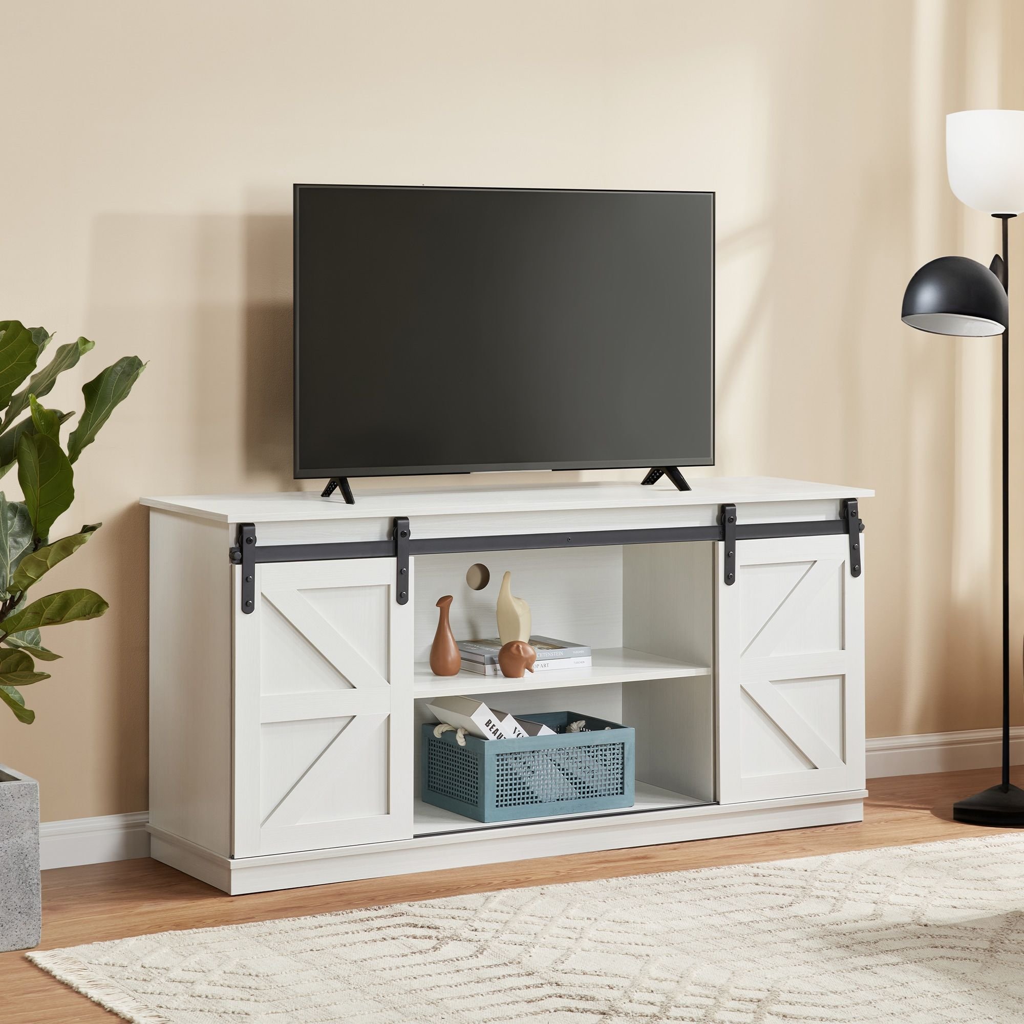 58" Farmhouse TV Stand and Entertainment Center for Televisions up to 65 Inchs,with Sliding Barn Doors and Storage Cabinets,White 58" Farmhouse TV Stand and Entertainment Center for Televisions up to 65 Inchs,with Sliding Barn Doors and Storage Cabinets,White 58" Farmhouse TV Stand and Entertainment Center for Televisions up to 65 Inchs,with Sliding Barn Doors and Storage Cabinets,White