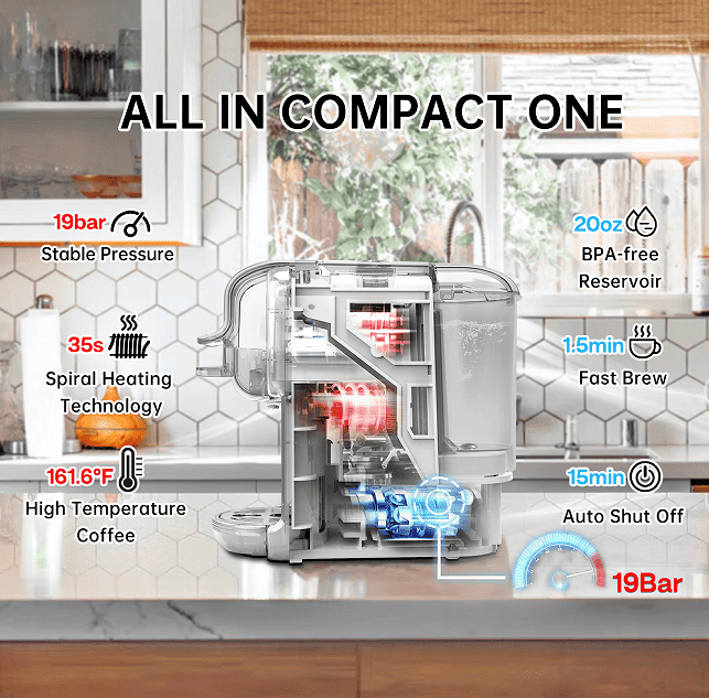 This versatile espresso machine comes with 5 different adapters and is compatible with Kcup capsules, Nes capsules, DG capsules, ESE coffee capsules and ground coffee, giving you more options for the enjoyment of making coffee at home.