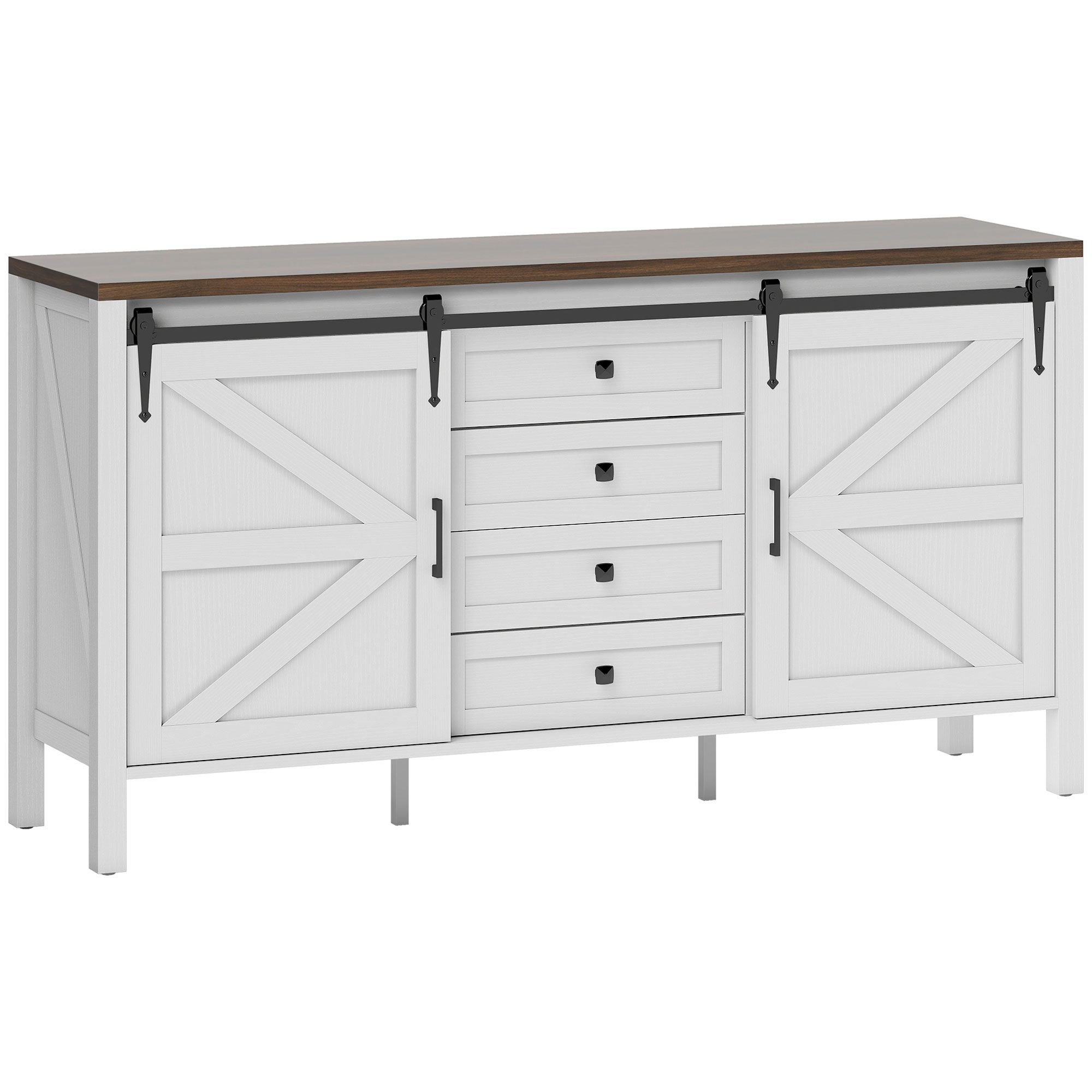 59" Buffet Cabinet, Farmhouse Sideboard with Thick Top, 2 Barn Doors, 4 Drawers and 2 Adjustable Shelves, White
