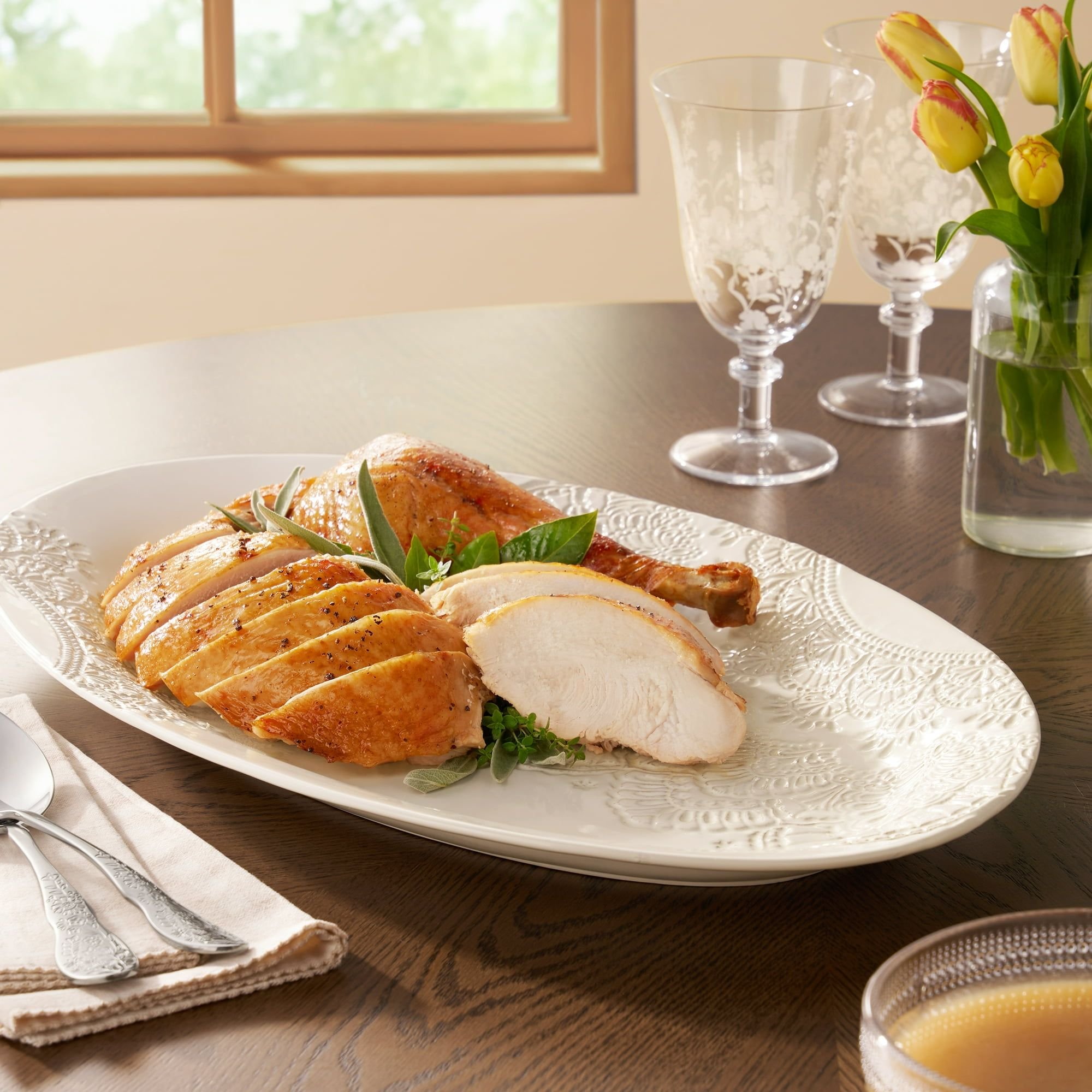 Elegant Design: Features an embossed lace-inspired pattern, adding a vintage-style elegance and beautifully textured finish to the serving platter.Generous Dimensions: Measures 20 inches long, making it ideal for serving family-style meals, roasted meats, vegetables, baked goods, and holiday favorites.Durable Material: Crafted from sturdy stoneware, ensuring durability for both everyday use and special occasions.Convenient Reheating: Microwave safe, allowing for easy reheating and serving of various dishes.Versatile Aesthetic: Boasts a classic white finish that seamlessly coordinates with any existing dinnerware and table setting.