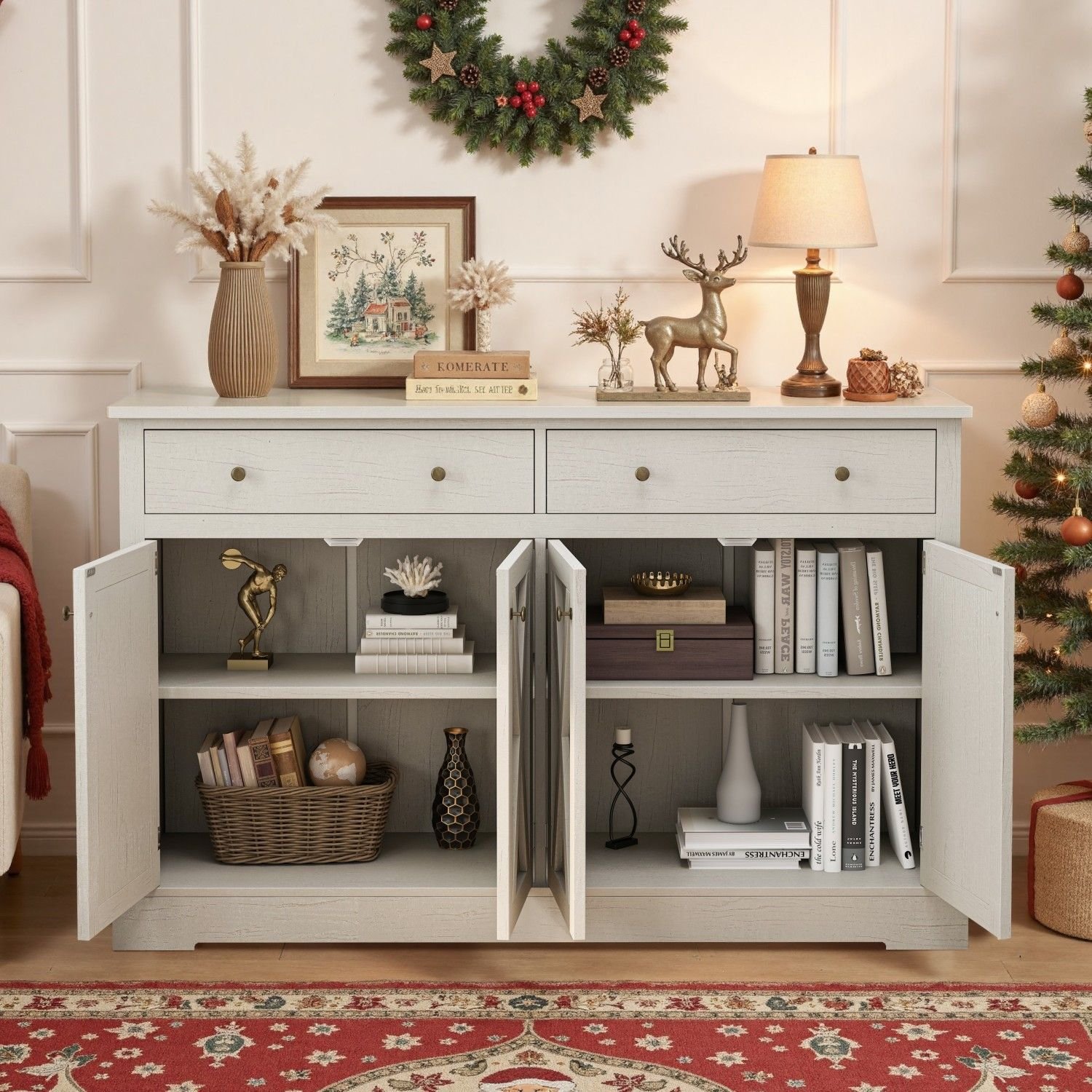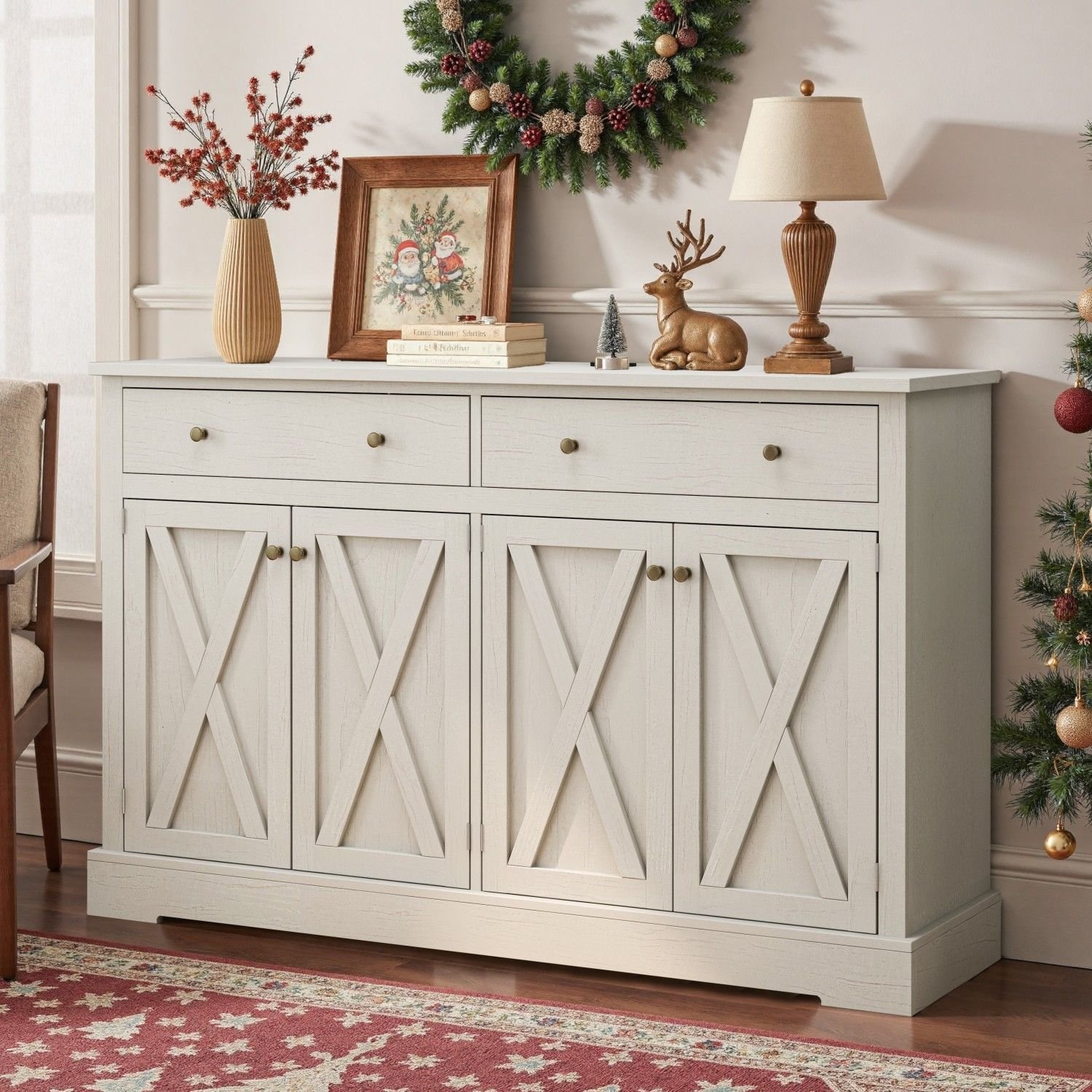 Exquisite design: The vintage four-door sideboard features a unique X-shaped design on the doors, adding a touch of elegance to your dining area while seamlessly blending with modern or traditional decor.