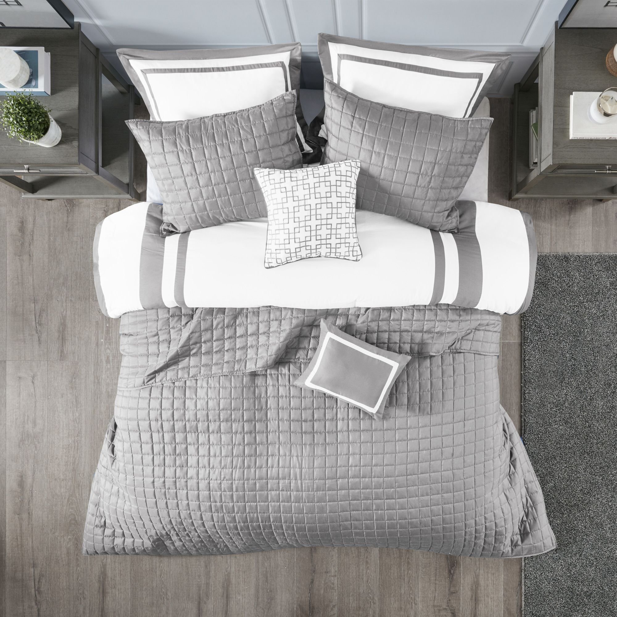 Set includes 1 comforter with 2 matching shams, 1 quilt with 2 matching shams, 1 square and 1 oblong throw pillows
