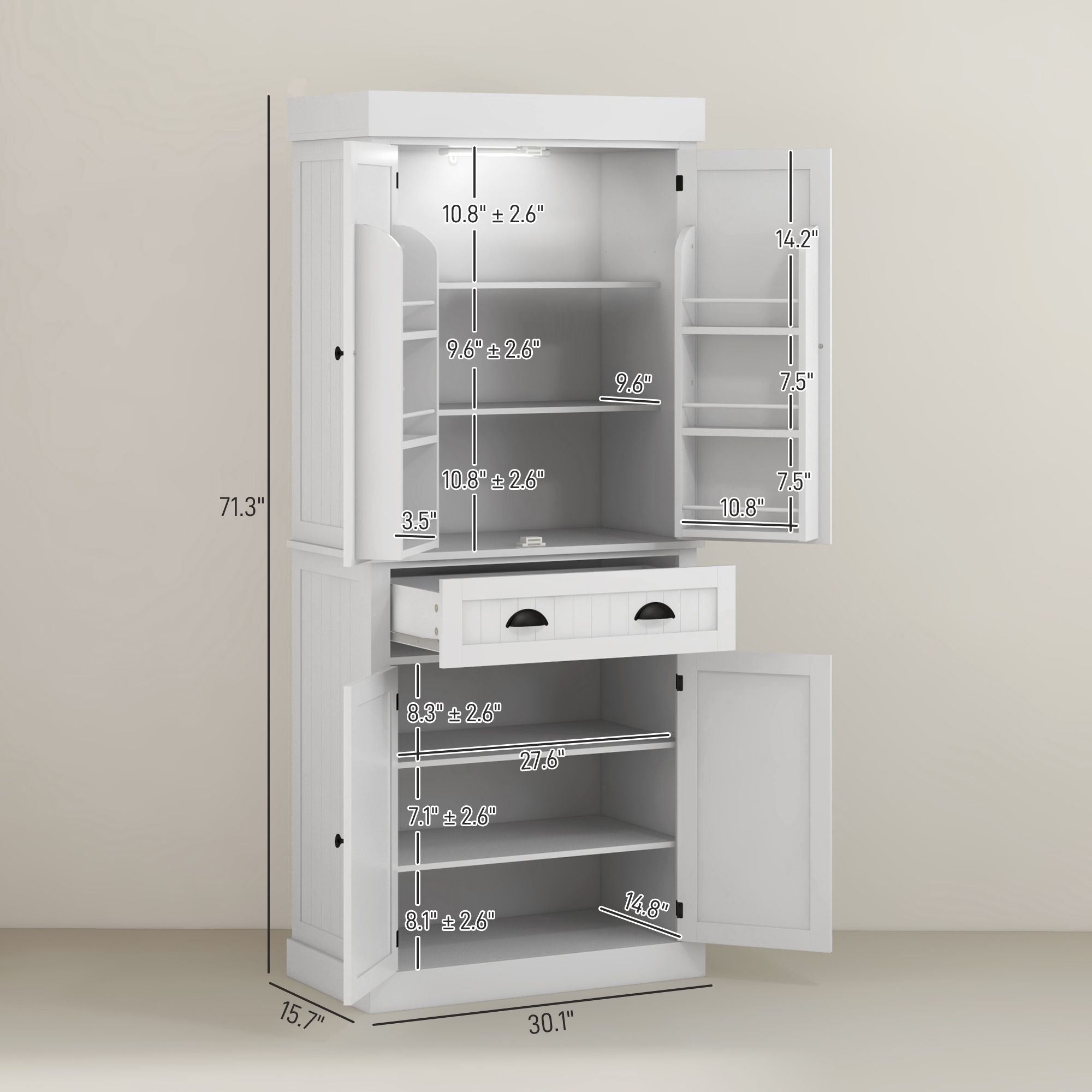 71" Tall Pantry Cabinet, Kitchen Storage w/ LED Lights, Drower & Adjustable Shelves, Freestanding Pantry for Dining, White 71" Tall Pantry Cabinet, Kitchen Storage w/ LED Lights, Drower & Adjustable Shelves, Freestanding Pantry for Dining, White 71" Tall Pantry Cabinet, Kitchen Storage w/ LED Lights, Drower & Adjustable Shelves, Freestanding Pantry for Dining, White