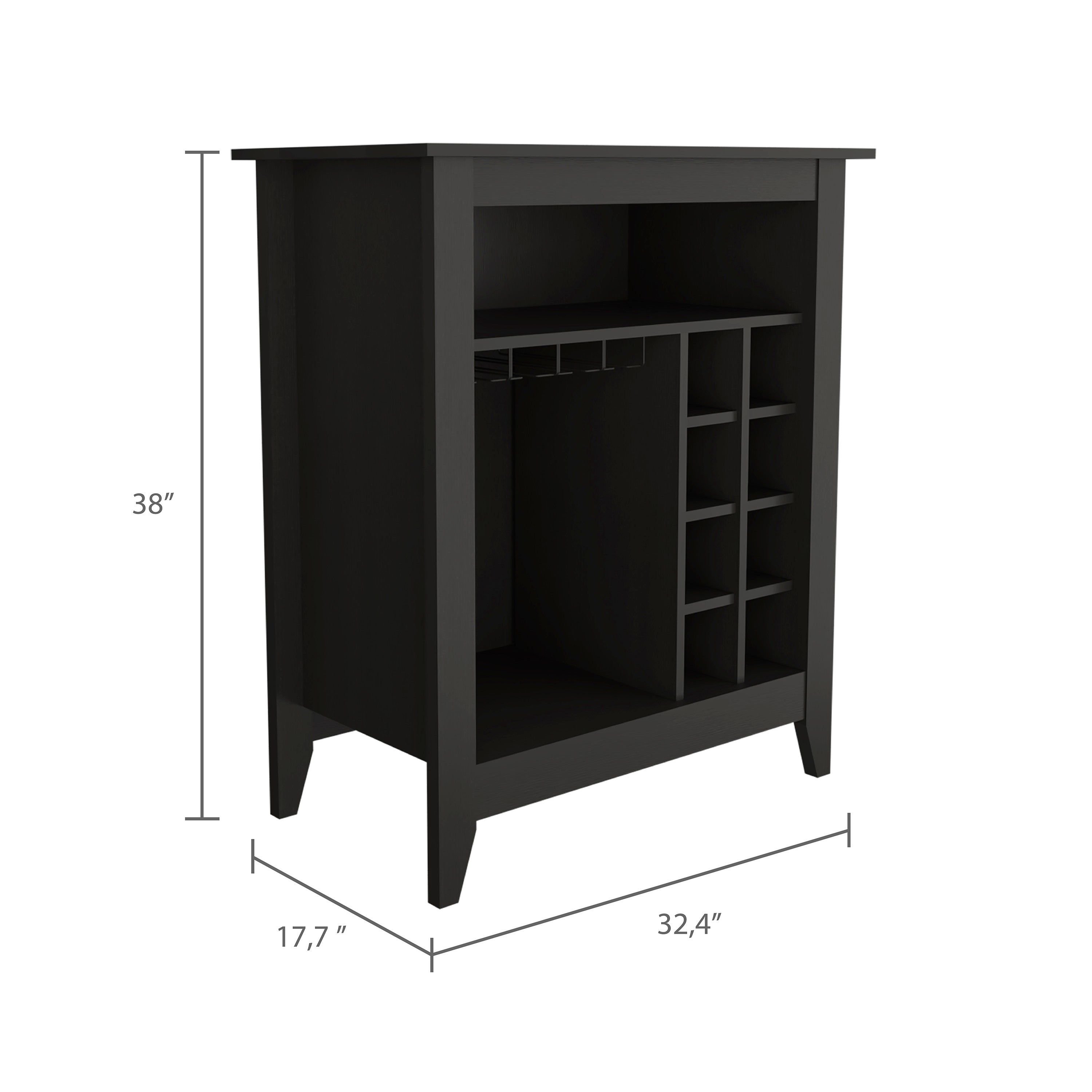 If you're a true wine connoisseur who needs plenty of storage for your bottles, The Future Bar Cabinet's ample storage for your home bar is the perfect blend of elegance and comfort; this bar has eight cubicles(4.8''H X 4.4''W) for your favorite wine, plenty of storage space for your glasses, and an Interiorshelf, in addition to its ideal superior-top (37.12'')for decoration.38"H x 32.4"W x 17.7"D Dimensions, manufactured wood construction in a classy espresso color.